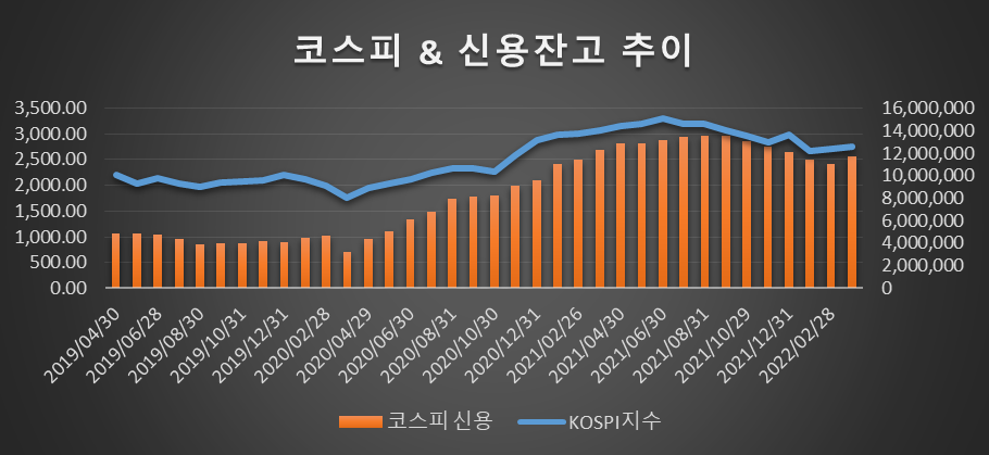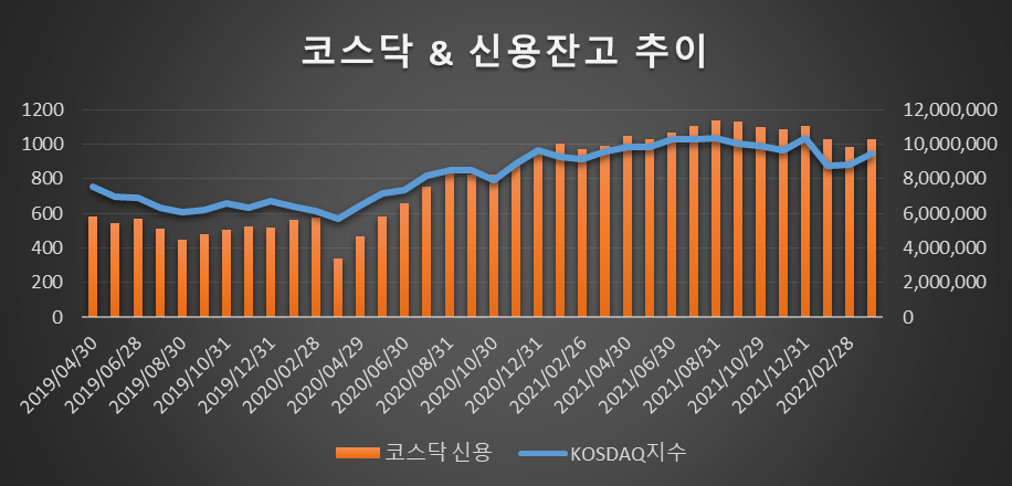 - 다음은 국내 증시 코스피, 코스닥과 신용잔고 추이를 그린 표입니다.