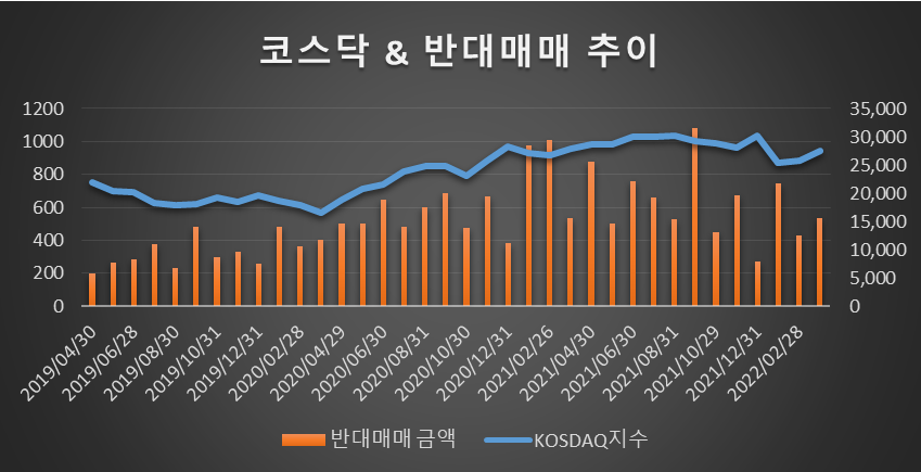 - 다음은 국내 증시 코스피와 코스닥과 반대매매 금액 추이를 그린 표입니다.