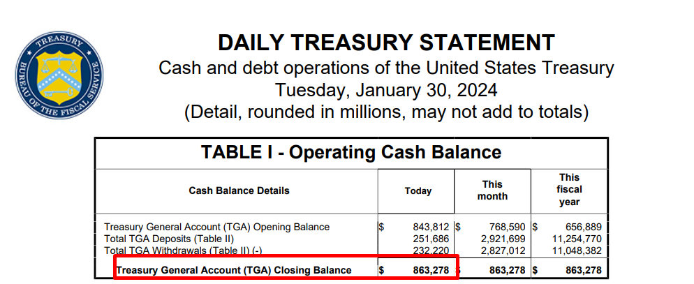 - '24년 1월 30일 기준으로 TGA의 잔고는 $863,278M이며, '23년 바닥을 찍고 다시 반등하는 모습을 알 수 있음