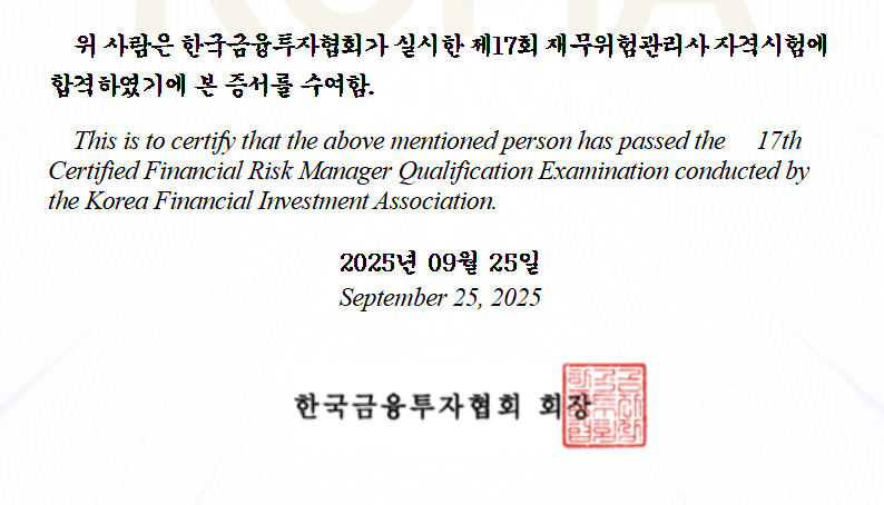 개인적으로 난이도가 있다고 느꼈던 시험인 국내 FRM 재무위험관리사의 후기와 기억나는 기출문제들에 대해 정리해보겠습니다.