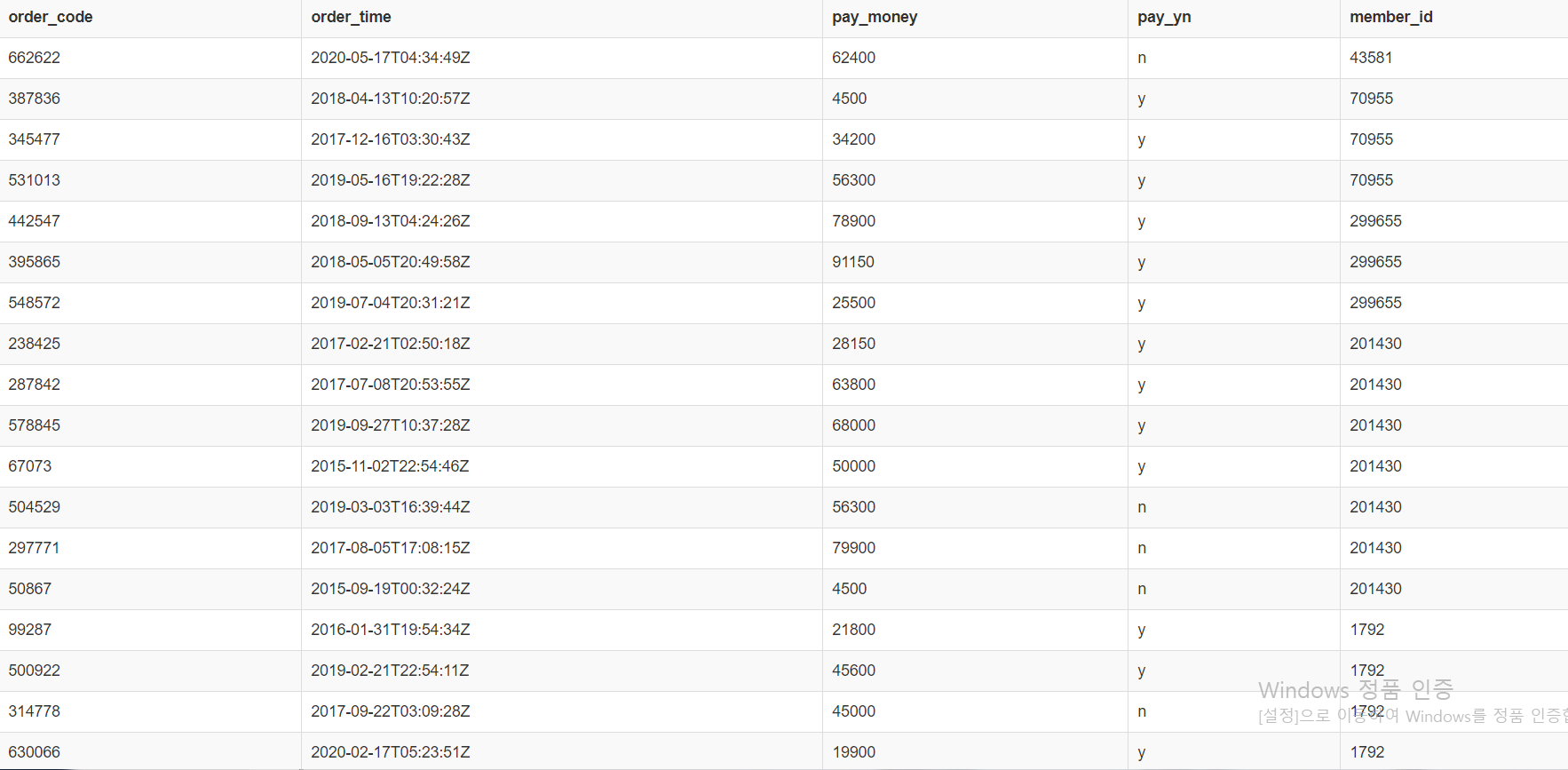 (`order_code` int, `order_time` datetime, `pay_money` int, `pay_yn` varchar(1), `member_id` int)
