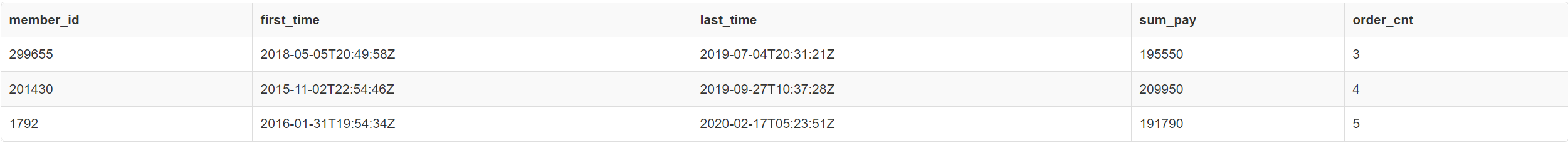 select a.member_id, b.first_time, b.last_time, b.sum_pay, b.order_cnt