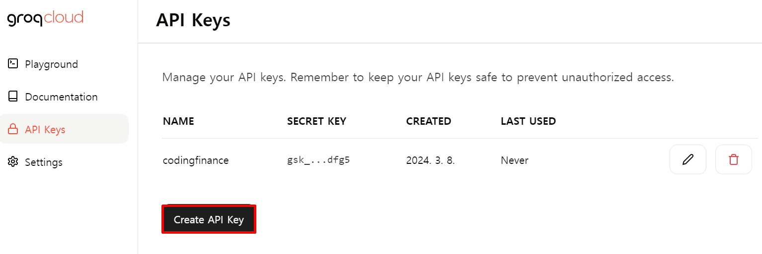 - Groq API 사용을 위해서는 GroqCloud에 접속하여 로그인 후, API Keys > Create API key 버튼을 클릭하여 API Key를 발급 받을 수 있음